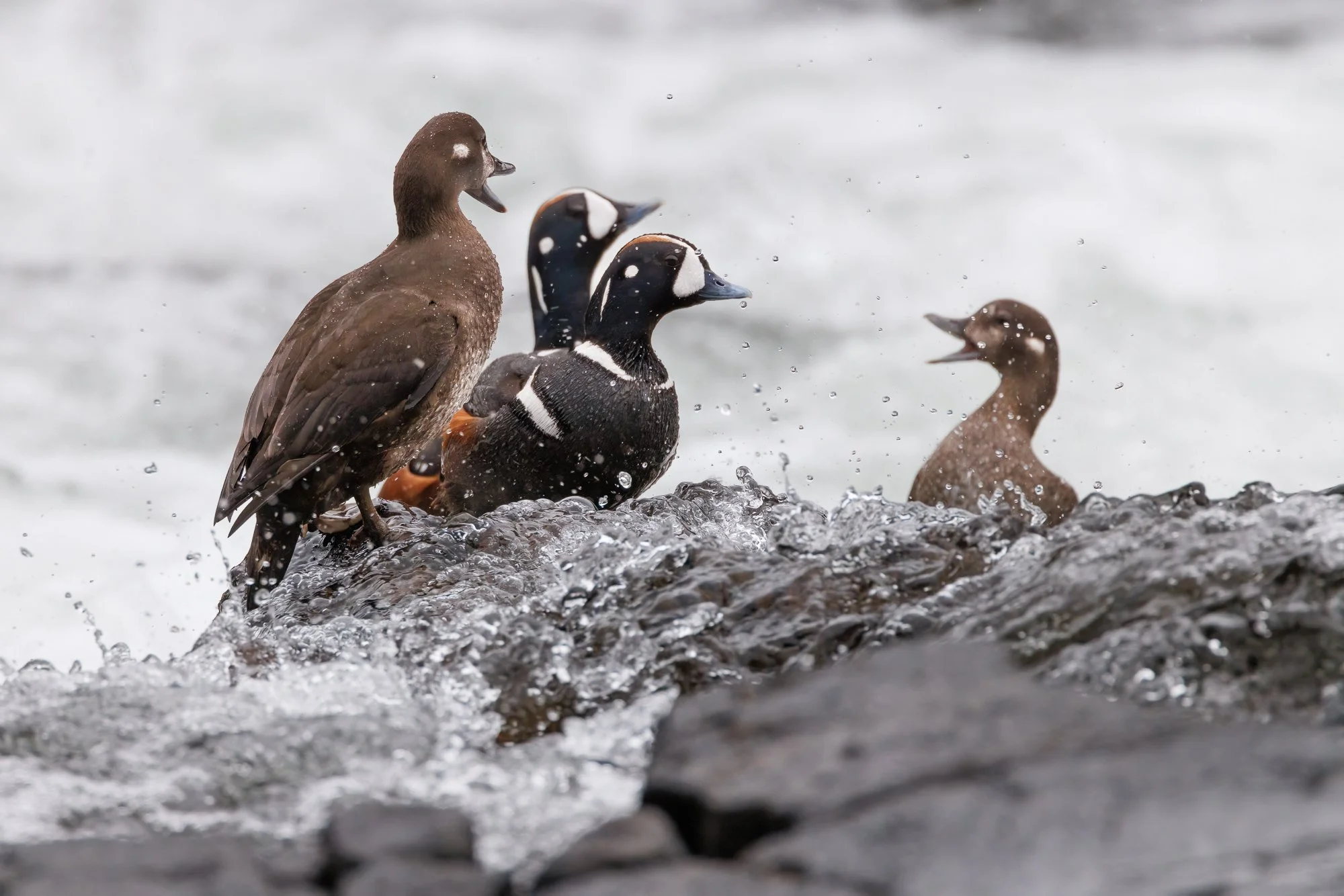 “Turbulent northern waters are favored by this strikingly patterned little duck. It is often found in summer on rushing rivers, diving and swimming against the current, climbing easily on steep and slippery rocks above the water. When moving inland, pairs of Harlequins usually fly low, following every bend of the river rather than taking overland shortcuts. In winter, seems to choose the roughest coastal water, with rocks pounded by the surf. Studies show that many adult Harlequins have had broken bones, probably a result of their rough surroundings.”
