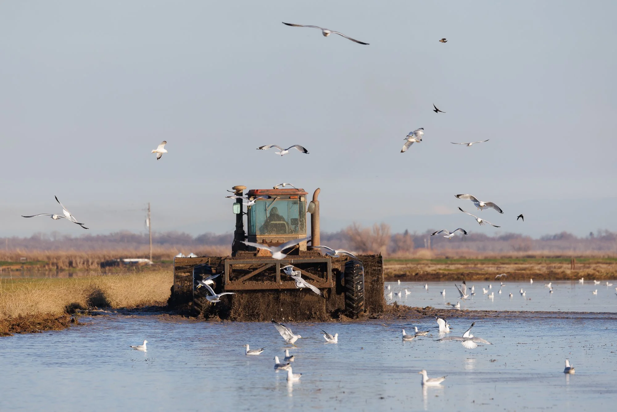 Gulls swarm the field where the stomper has worked, looking for any tidbits that get stirred up.