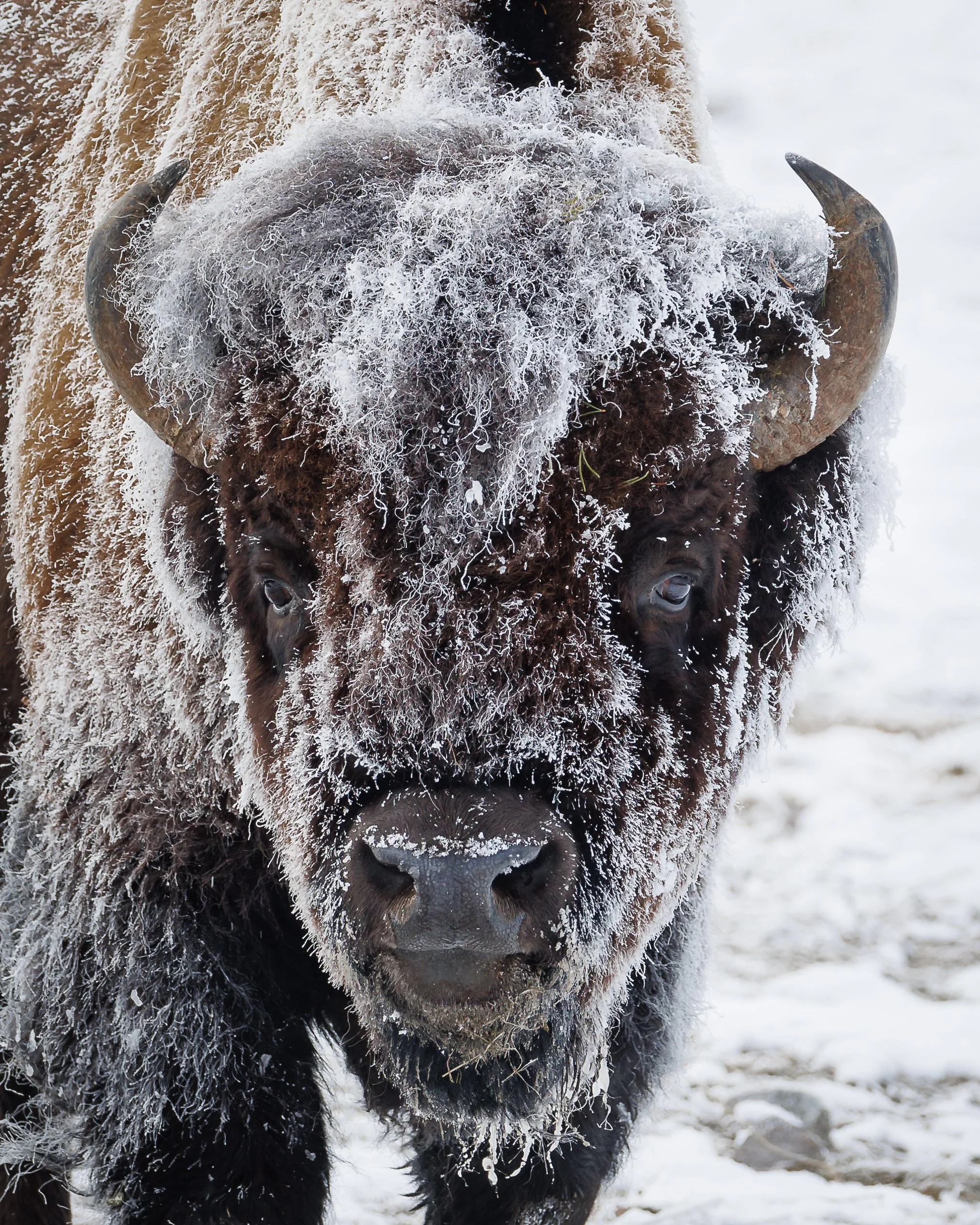 Bison use their enormous heads by swinging them back and forth to brush away the snow that covers their path. This allows them to move forward and also uncover edible grass and plants. It’s a continuous effort until it’s time to move to another area or to process what they’ve already eaten. It’s especially important that they stay nourished since the females are all pregnant and will give birth in the spring.
