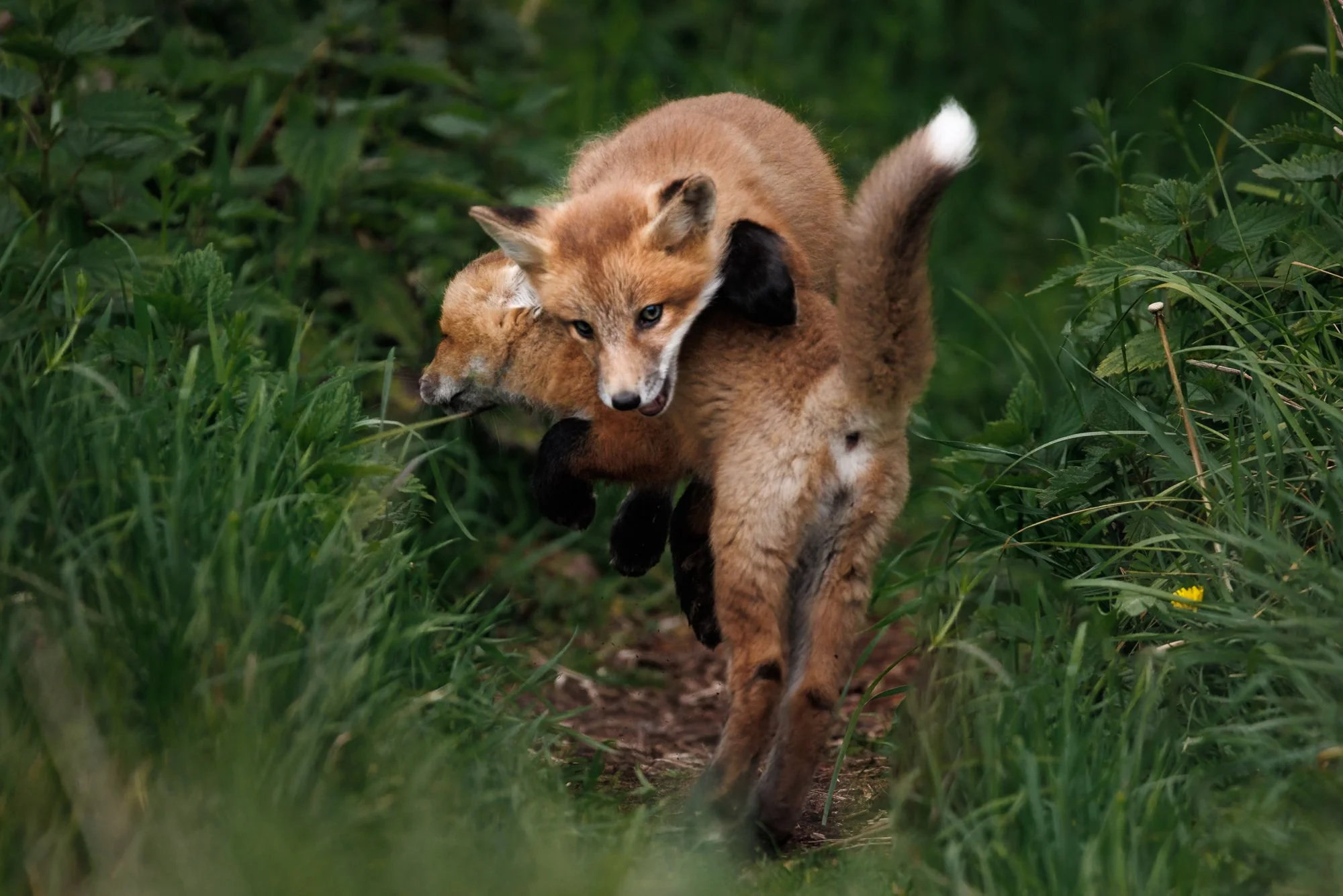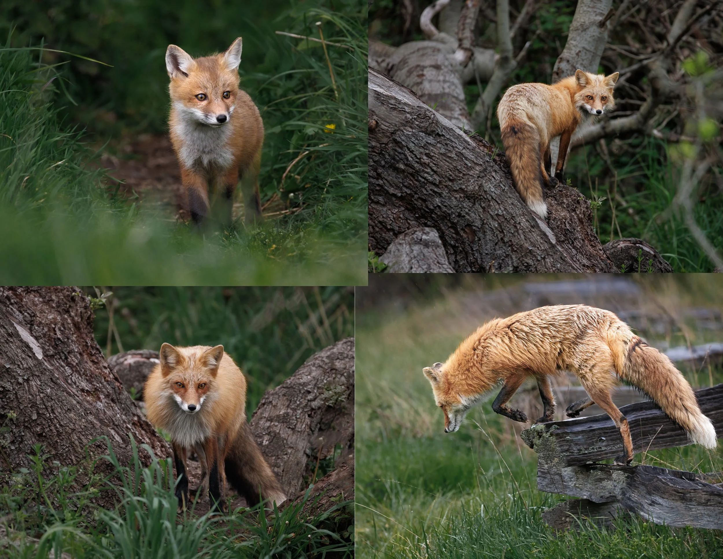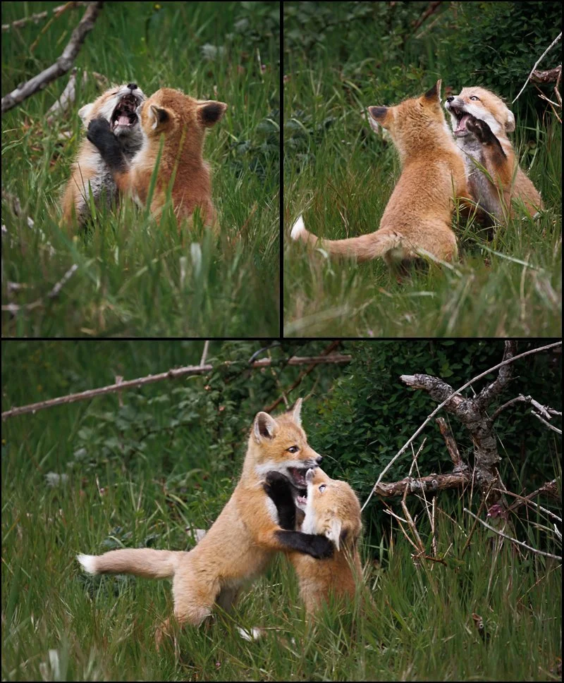 We observed adult foxes, adolescents, and kits grooming, hunting and playing. The little kits were so entertaining to watch. Their energy seemed boundless as they chased and spared. At first I likened them to kittens, then puppies, as they entertained us with their antics. Although, I believe this behavior is training for their coming independence.