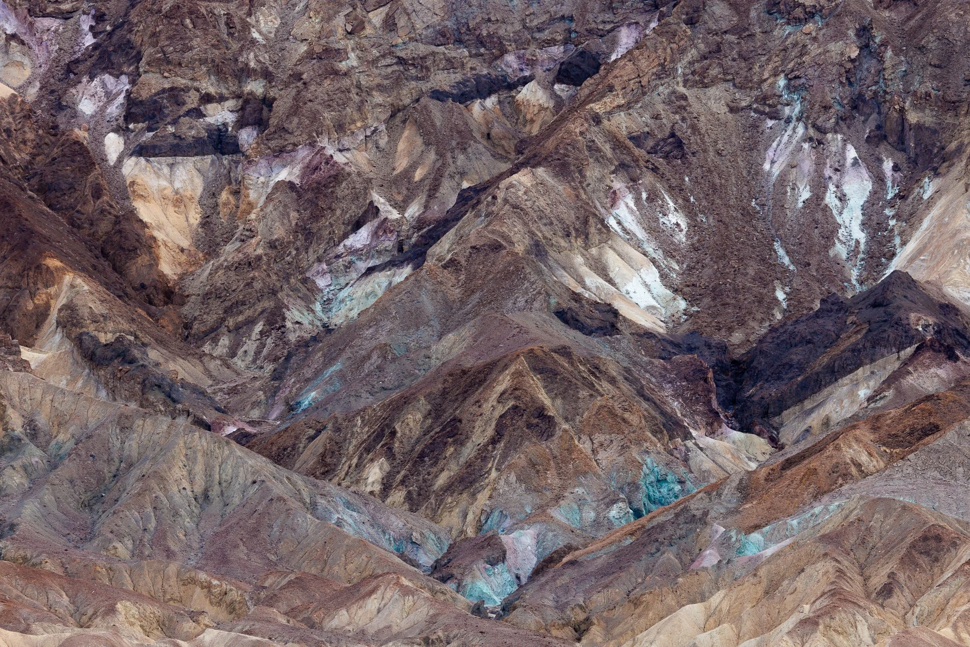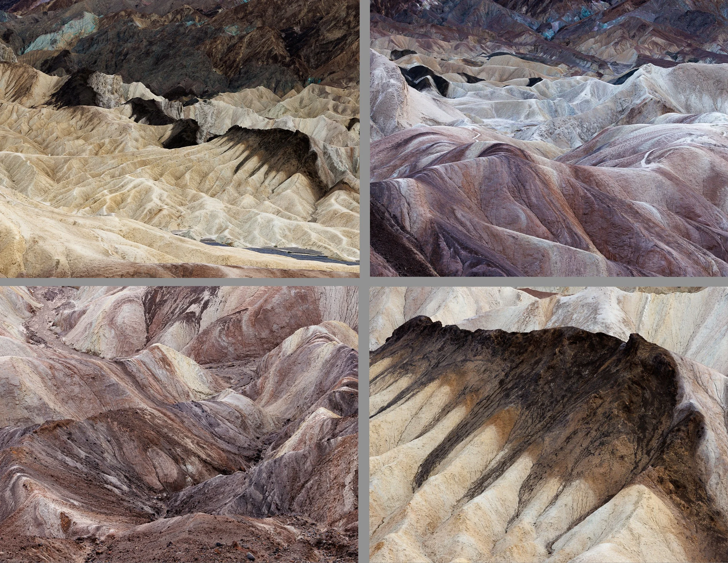 Standing on top of the ridge trail near alongside several other photographers, tripod next to tripod, I stood in awe of the scene before me. While it transformed with the setting sun, it was a location I’d been to before, but I didn’t remember it looking like this. It was as though I was viewing landscape mosaics, artistic patchworks of rocks, minerals, and soil in colors that are not my idea of a typical desert scene. A desert landscape is shades of brown and tan, or so I believed. This was not Death Valley National Park as I remembered it. It was much more beautiful and diverse than that!