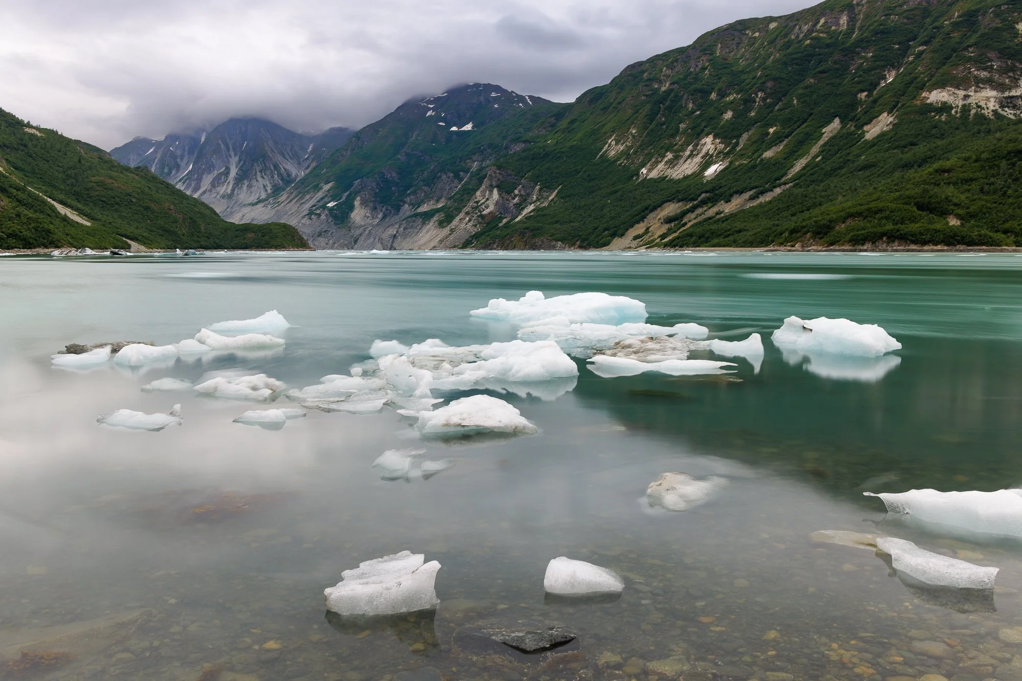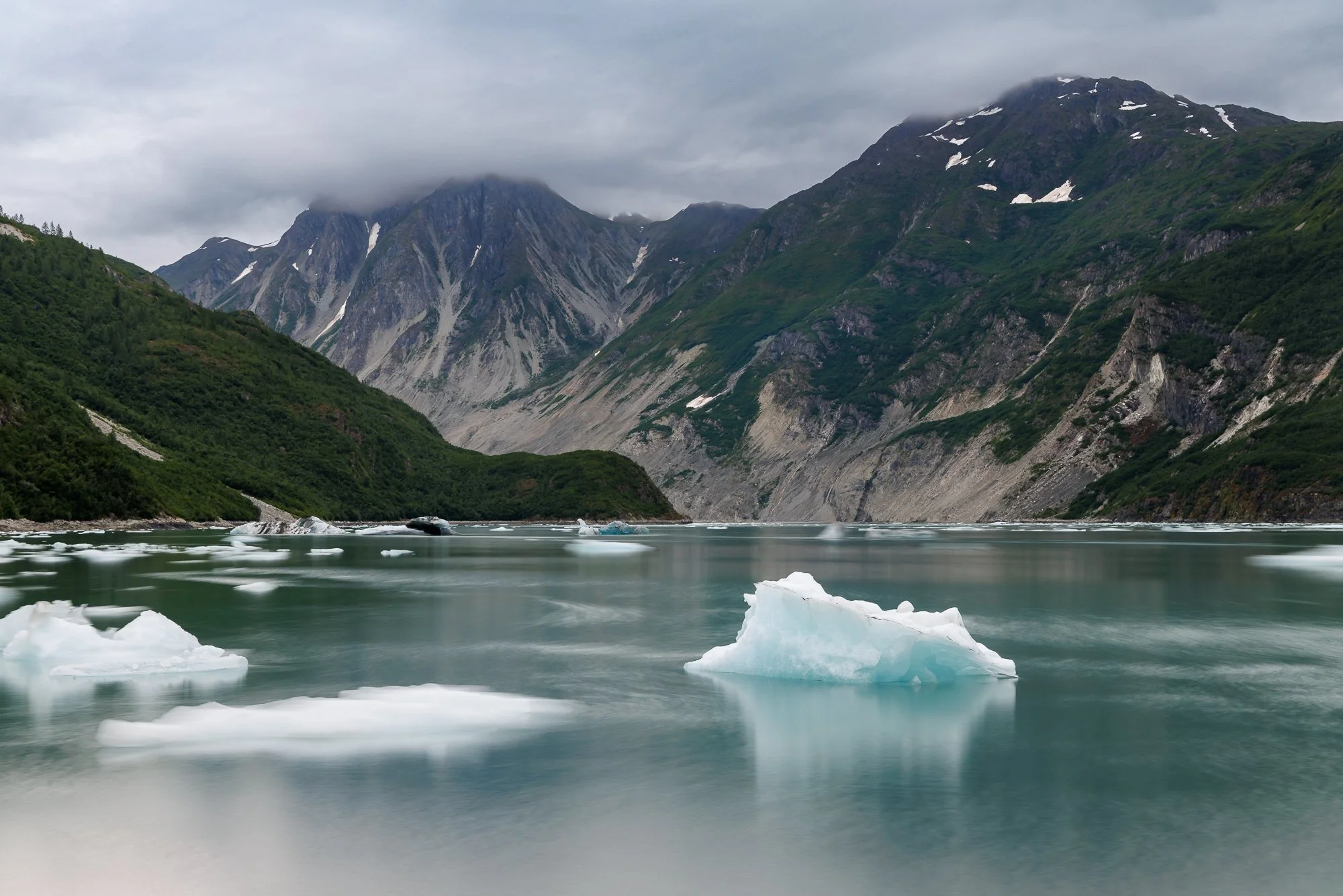 As we returned to the area where the Muir Inlet met with the McBride Inlet, we went ashore to photograph the floating icebergs. This was an opportunity to use a slow shutter to smooth out the water. The faster moving icebergs looked like white blurs, while there were a couple that had run aground temporarily.