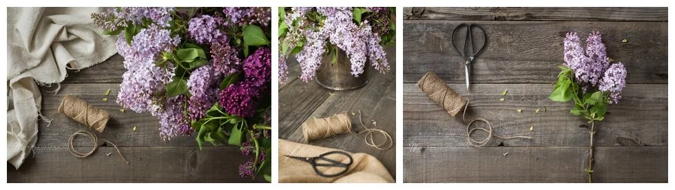 various images of lilac blossoms with twine