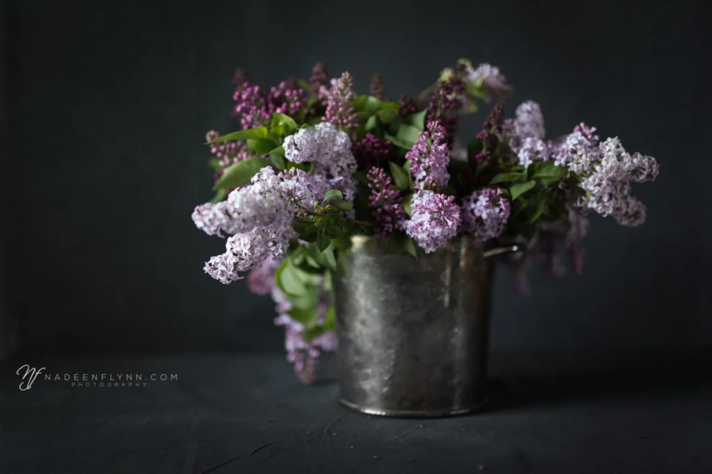 bouquet of lilac blossoms in tarnished bucket
