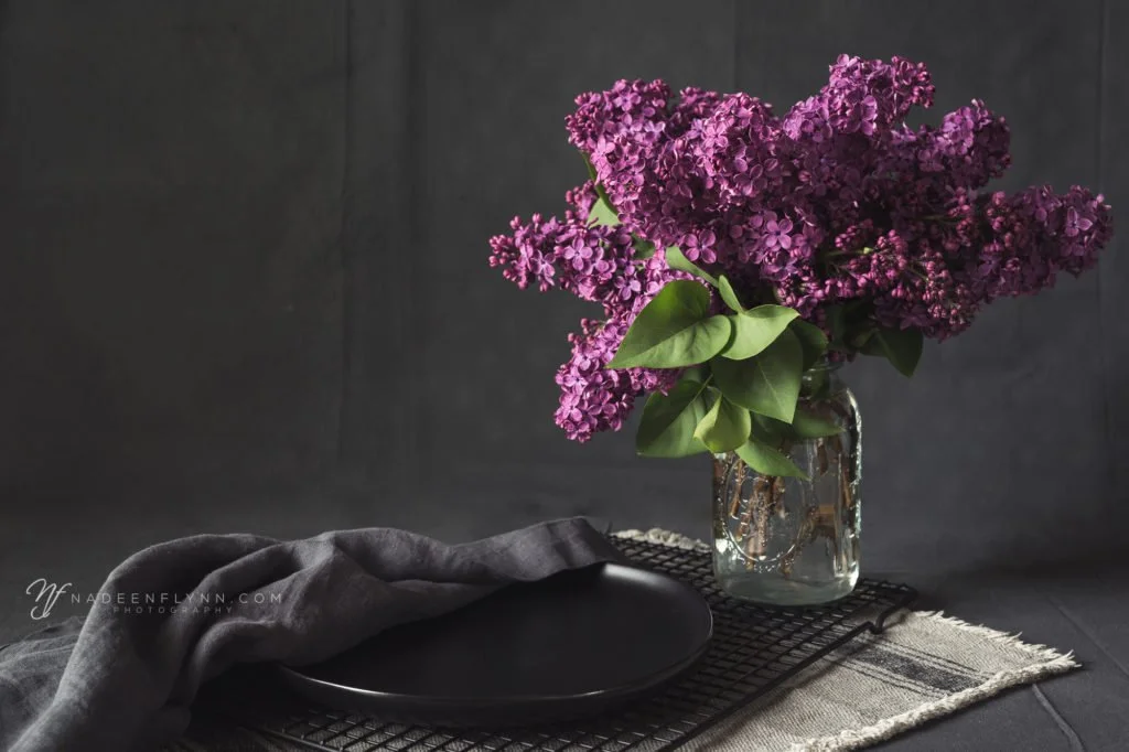 deep purple lilac blossoms in a mason jar