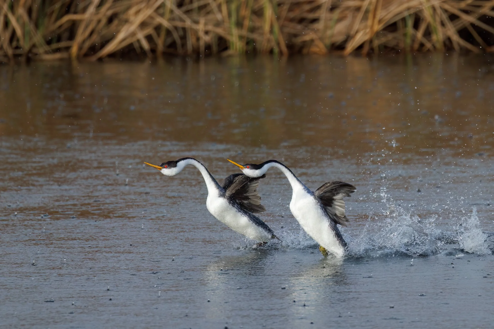 When it comes to courtship, rushing grebes are true performers. Their intricate dance routines involve synchronized movements, elaborate head bobbing, and even offering gifts of plants to their potential partners. It's a spectacle that never fails to impress observers lucky enough to witness it. As the courtship progresses, grebes raise up side-by-side and appear to run across the surface of the water.