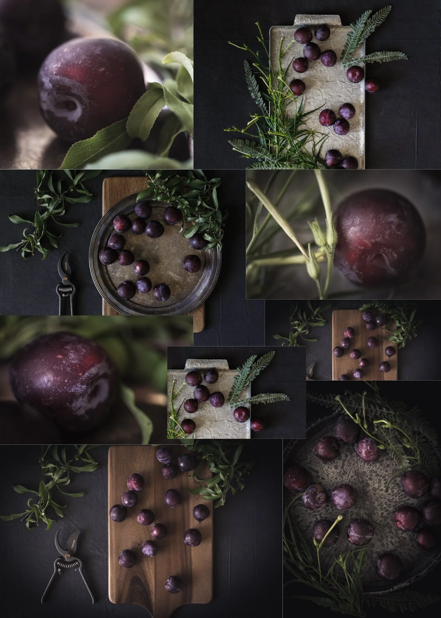 Once the plums were picked and I realized my good fortune, it was time to plan how I would photograph these plums. I’ve photographed plums in the past so I wanted this shoot to be different. I made a very loose plan, headed out to the garden to gather some greenery, and back inside to look for other props I could use in my still life flat-lay. That is when the ‘set up’ began, and that is where this video begins.