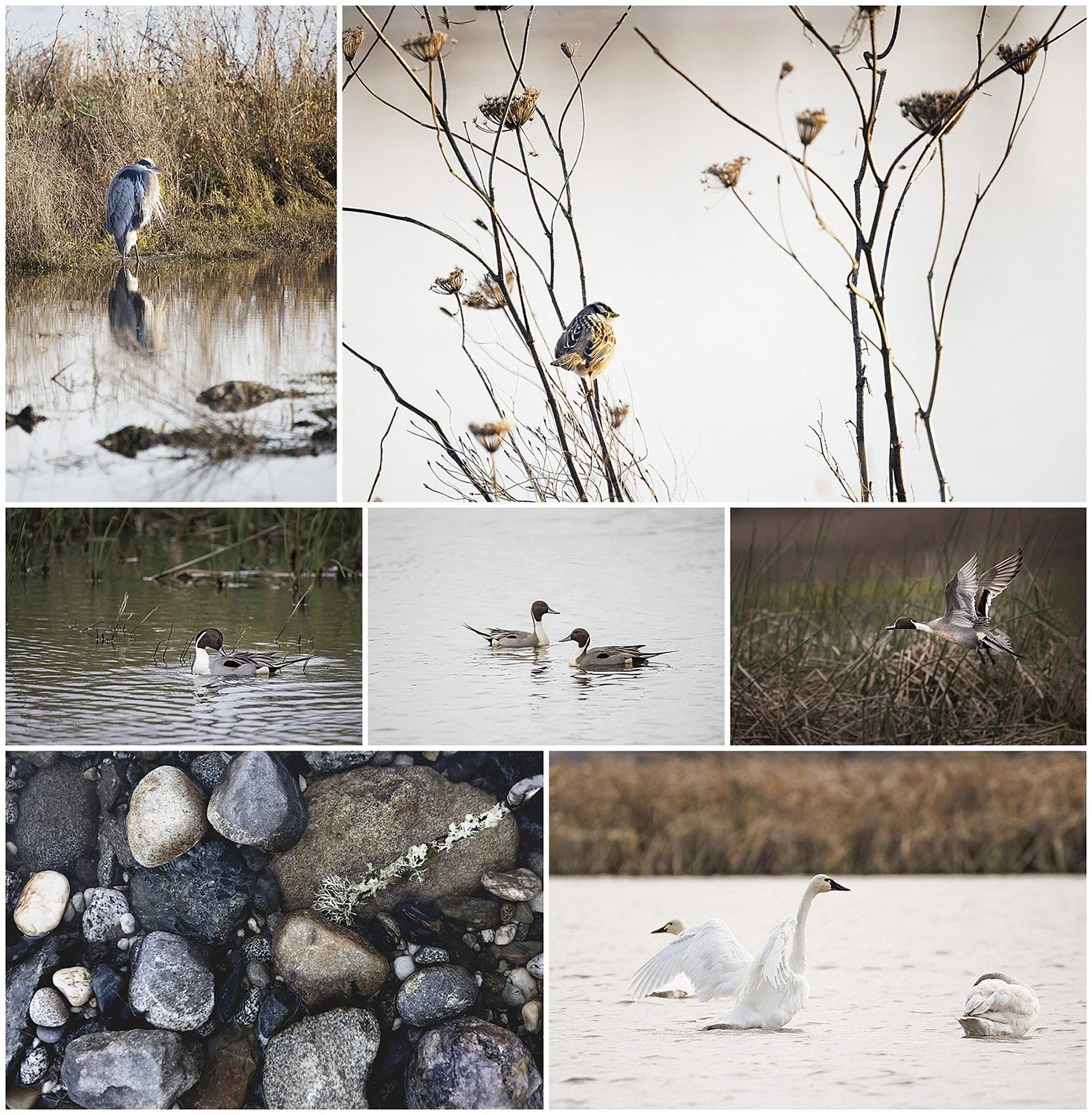 Here are a few other birds I photographed the first week of the new year, along with some interesting rocks. Great Blue Heron, White Crowned Sparrow, three Pintail duck images, rocks, and Trumpeter Swans.